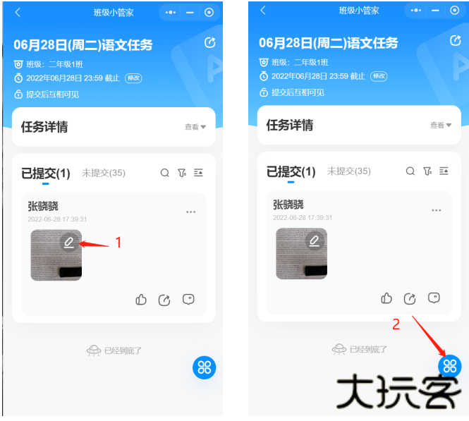 点击第一张图片箭头位置直接进入到批阅的页面,或者您也可以点击第二张箭头位置进入到点评页面
