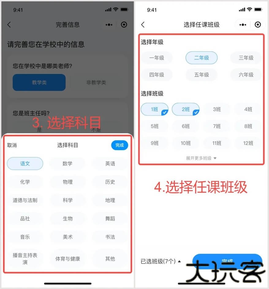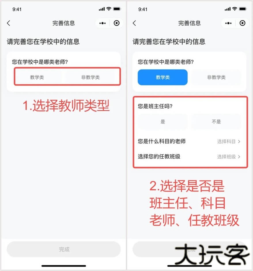 如果是教学类老师的话,需要进一步完善信息例如是否是班主任、任教科目、任教班级信息;如果是非教学类老师的话,则无需填写以上信息。