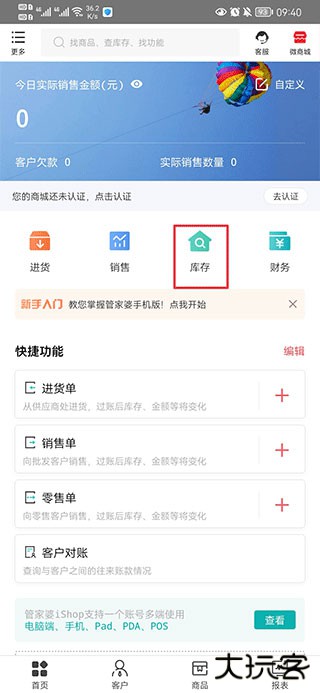 1、打开管家婆软件手机版,在首页中点击库存
