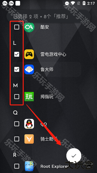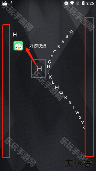 7、上下滑动左侧或右侧屏幕,我们通过头文字英文缩写可检索手机内安装的软件或系统内置程序
