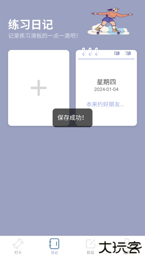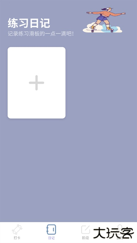 3、【日记】页面,点击“+”记录练习滑板的一点一滴;