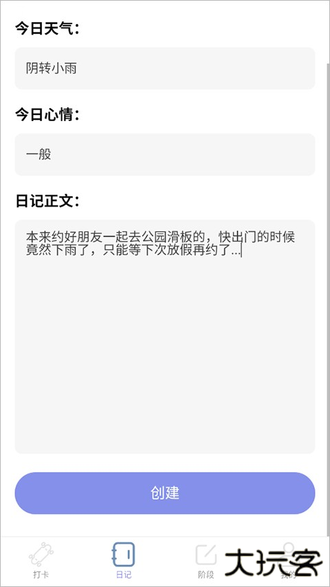 4、日记页面有天气、心情和正文,操作也很简单,直接编辑,然后点击下方的创建即可;