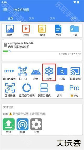 1、进入FV文件管理软件界面,点击打开设置。
