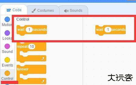 3、拖动 【Control】积木区的【wait 1 seconds】,可让程序暂停1秒;