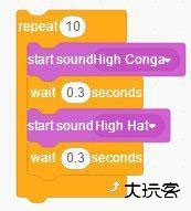 4、然后在程序区,将几个积木组合在一起,创建鼓声,如图;