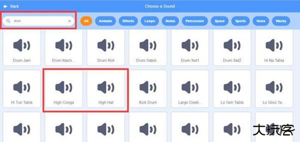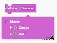 5、声音积木,点击向下按钮,可设置声音;