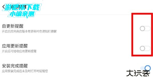 4.把【自更新提醒】和【应用更新提醒】全都关闭即可