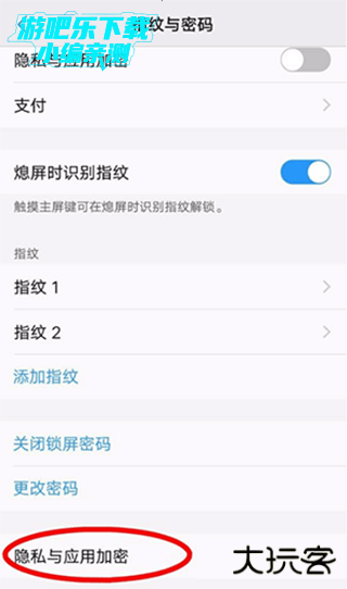 3、在指纹和密码页面点击隐私与应用加密按钮;