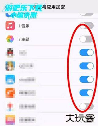 进入应用加密列表,找到并开启应用商店和游戏中心(如需要)的开关