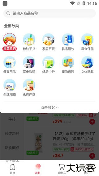 3、集优选水果、时令鲜蔬、禽鱼肉类等数十种商品分类、海量商品任您挑选。