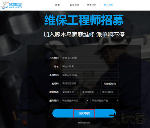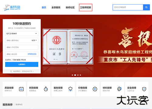 一、我们需要打开啄木鸟家庭维修app的官网,点击工程师招募。