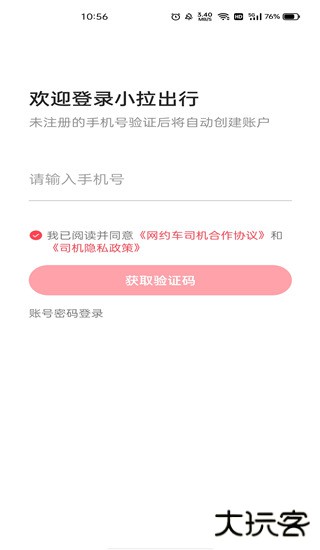1、下载安装小拉出行司机版app,打开输入手机号登录注册软件;