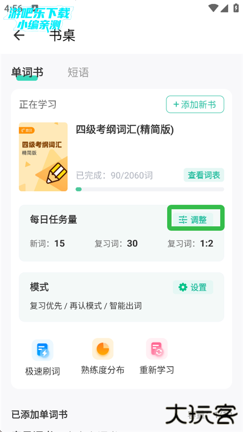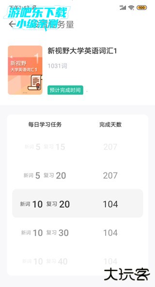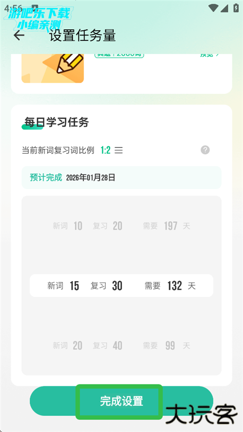 2、选定单词书,设置每天的任务量(新词数+复习词数),确认无误后,点击【完成设置】按钮。