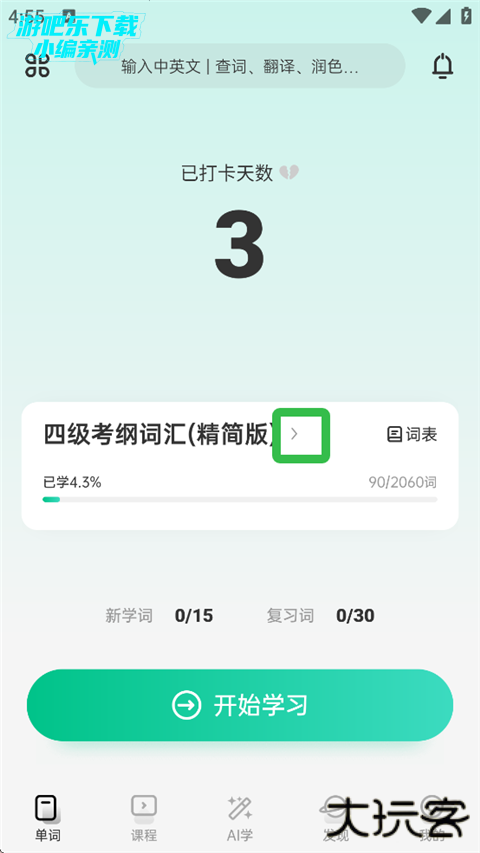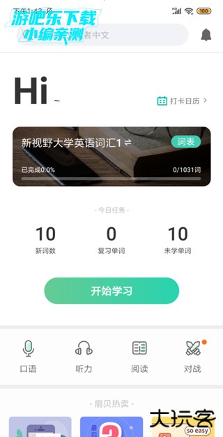 3、回到首页,就可以看到你选择的单词书以及设置的学习任务量,点击【开始学习】按钮既可开始背单词了。
