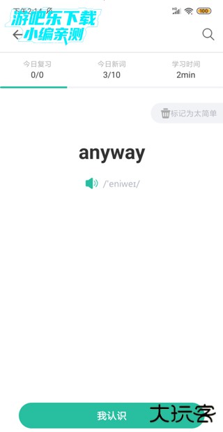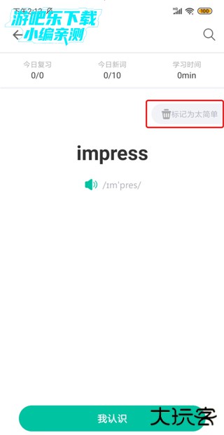 5、在单词自评页面点击右上角的【太简单】,则这个单词将被定义为简单词,不会在今后的学习中再次出现。