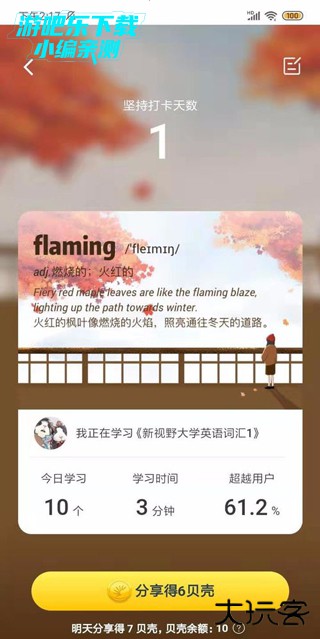 6、完成学习并打卡后,可进行分享,分享奖励贝壳(贝壳是扇贝体系内的虚拟货币,可用于兑换一些权益)