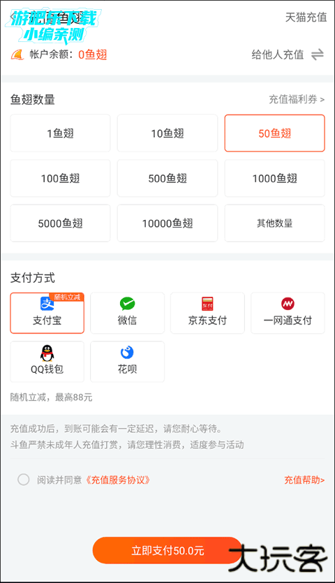 2、在充值鱼翅界面选择好鱼翅数量、支付方式后找到并点击“立即支付”选项;