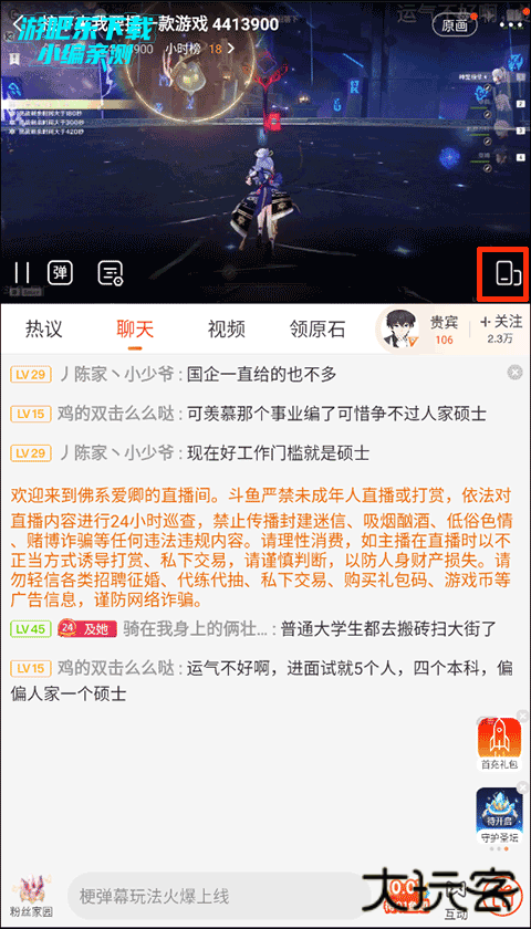 2、在直播房间中可以点击屏幕来发现任务栏,点击任务栏上的横屏模式;