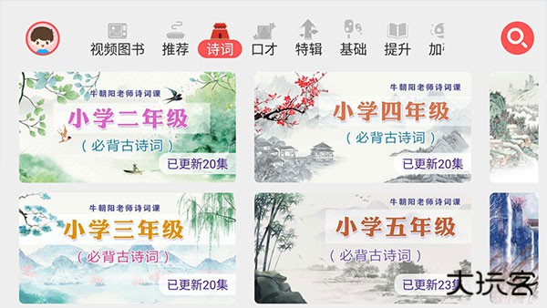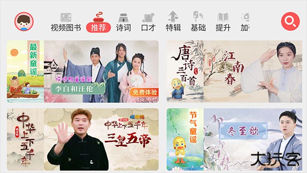 每周推出两篇经典诗词或文章的讲解与领读视频课程,每年100篇。每套诗文课程分三个视频,第一个视频讲解诗文的文化背景,第二个视频逐字逐句讲解诗文的意思,第三个视频是领读训练,示范者读一句,孩子可以跟着读一句,有滚动字幕提示,学起来非常方便。
