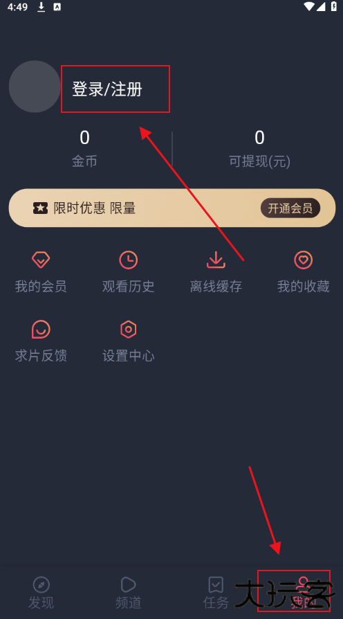 2、点击我的-登录/注册按钮;