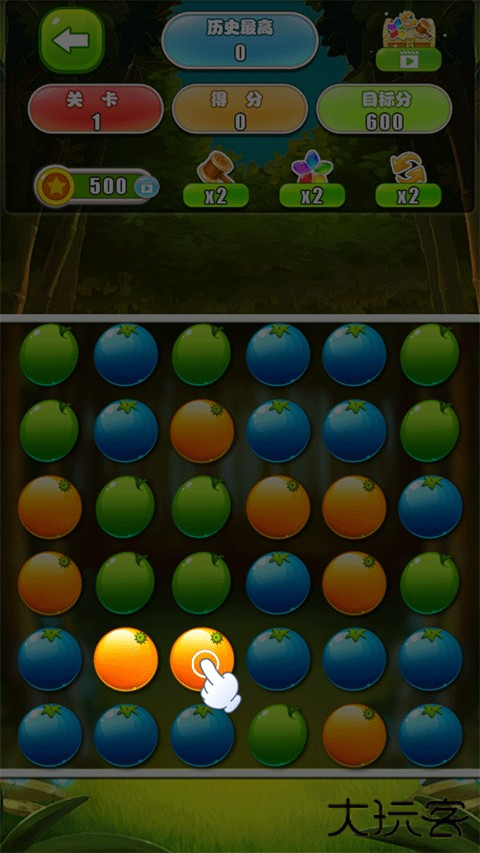 1、点击颜色相同且相邻的水果即可进行消除。