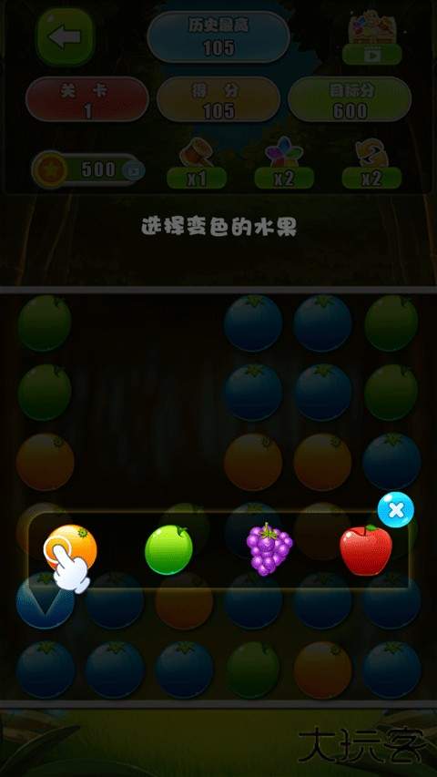 3、当消除遇到瓶颈的时候可以点击七色花道具,选择要变色的水果就能让水果变成相同的颜色消除。