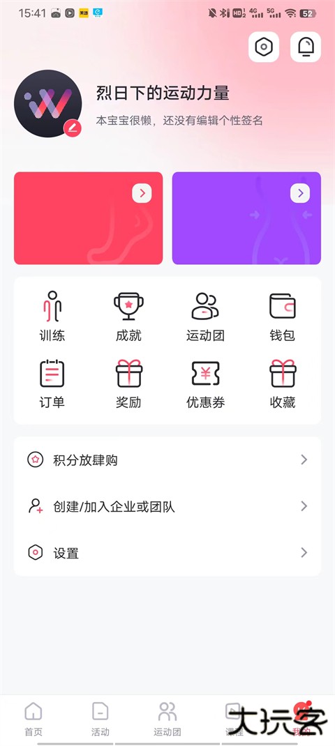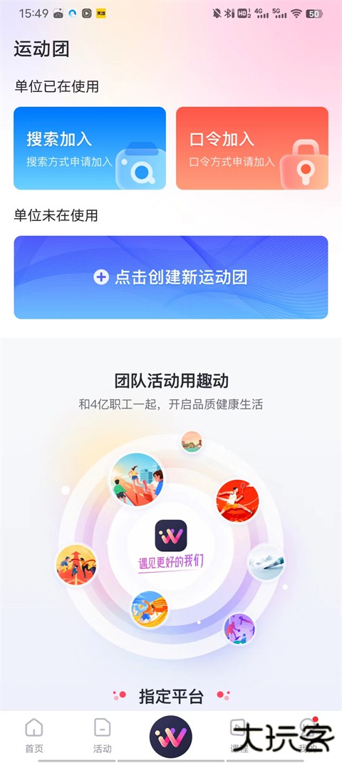 1、进入软件首页,我们点击运动团;