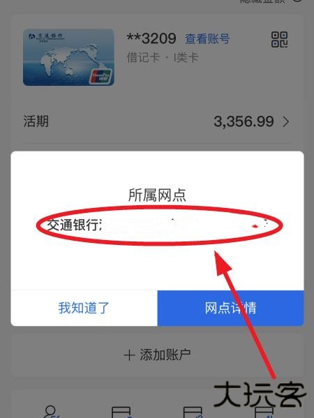 1、进入交通银行app,点击我的账户,选择你要查询开户行的卡片,点击如下图所示的所属网点;