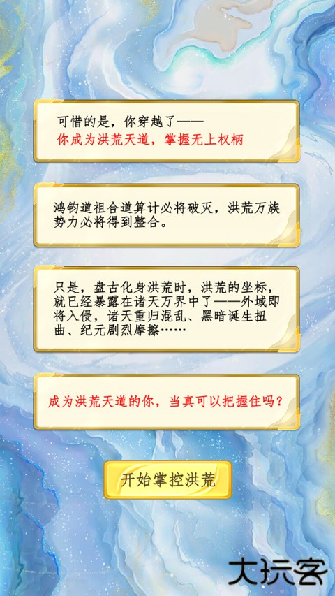 1、下载安装洪荒天道2主宰游戏后,会有一段背景介绍,玩家可以了解背景后更容易上手,之后开始掌控洪荒;