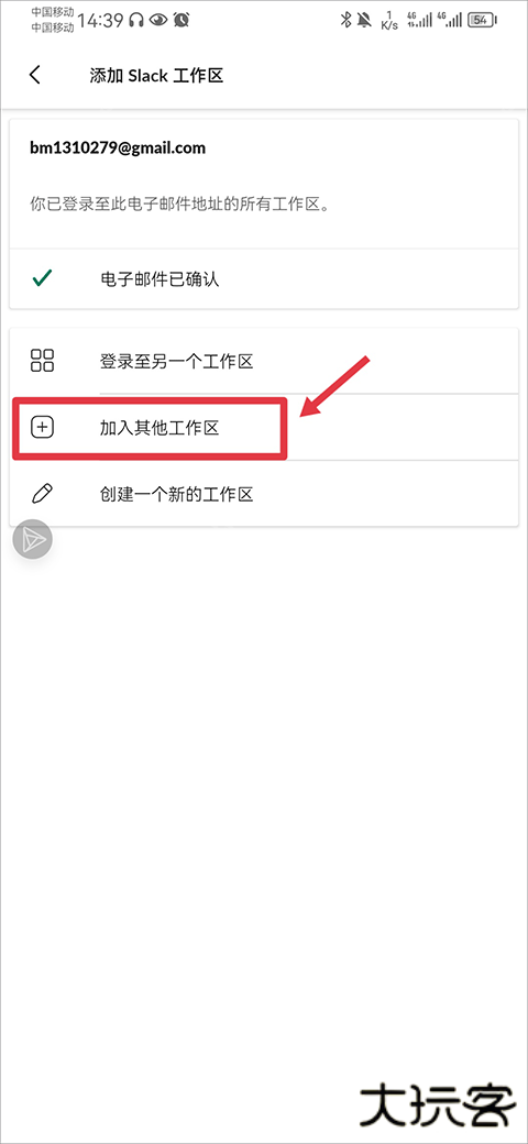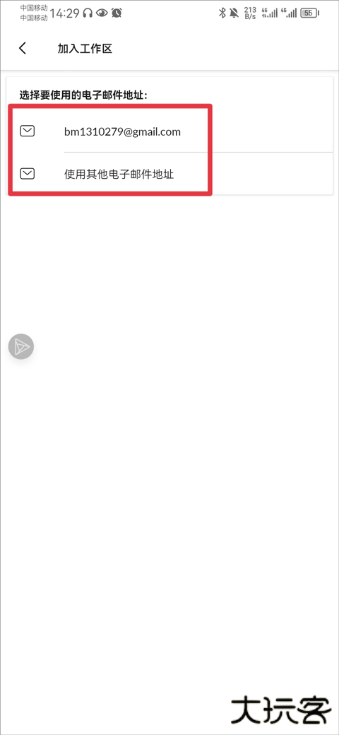 4、最后选择你要使用的电子邮件地址,如果有管理员向你发送邀请时,当你使用该电子邮件进入后就会有邀请链接,点击链接即可加入新的工作区