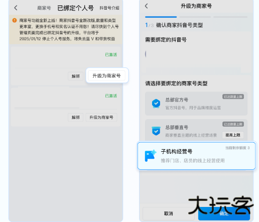 适用场景:商家已经用旧版抖音号后台绑定了个人号。由于个人号功能即将下线,需尽快升级
