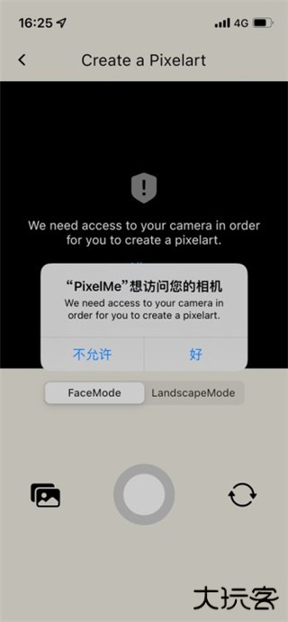 2、允许应用PixelMe访问你的手机相机,点击左侧相册图标即可添加照片,点击中间即可拍照;