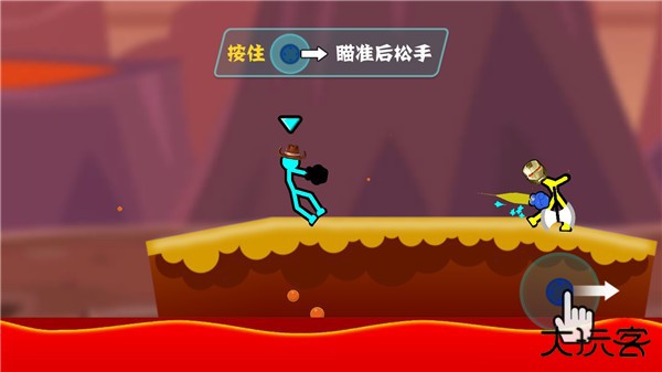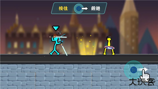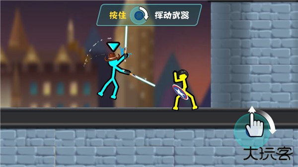 玩家在游戏中操控一个火柴人,利用简单的横版摇杆操作操控火柴人进行热血格斗。