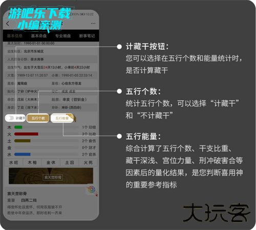 除此之外,智能五行分析模块对命盘的五行能量做了定量的分析,这就是我个的“五行个数”和“五行能量”功能