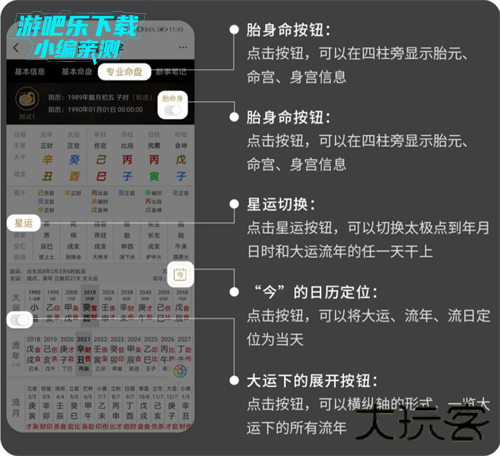 专业细盘在基本命盘的基础上,加上了大运与流年的罗列,便于大家进行命盘的时空研究。除此之外,还有几个细节功能需要留意: