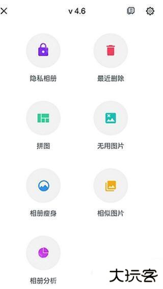 1、打开理理相册,在打开的主界面上,会看到全能相册所有核心功能模块,如“隐私相册”“最近删除”“相册瘦身”等,依个人需要,点击不同图标可进行相应操作。