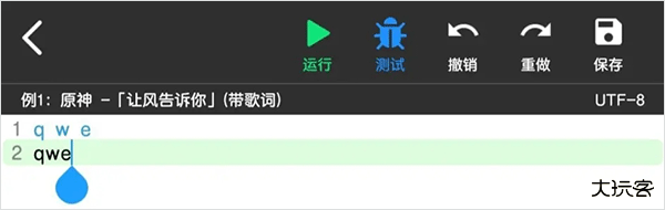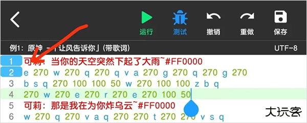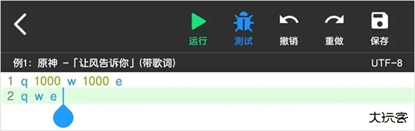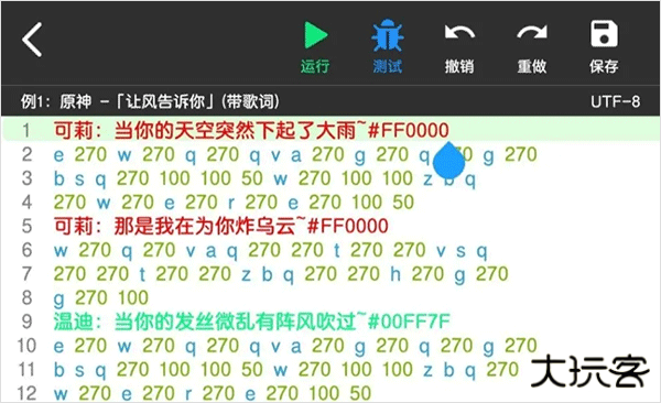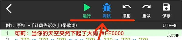 菜菜音乐盒提供了两种弹琴脚本测试方法,“ 运行 ”是指播放全部脚本,“ 测试 ”为播放左边序号有蓝色标记的一行或者多行脚本