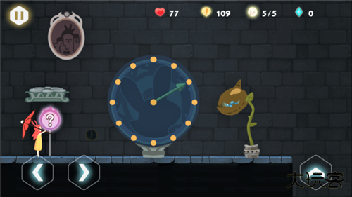 2、城堡内第一个解谜点:兔耳时钟,在场景中找到时针零件组合到兔耳时钟上,注意周围的提示,调整正确的时间,食人花即会张开嘴吐出宝珠,直至前方的台阶降下,这个解谜点就能顺利通过了。继续前行,通过前方的摆斧,我们来到城堡内的第二个解谜点。这里需要我们按一定顺序点亮石柱平台上的图案,4个图案随便按,全部按亮为止,过程中记下每个图案的点亮顺序就可以了,平台降落后通过。