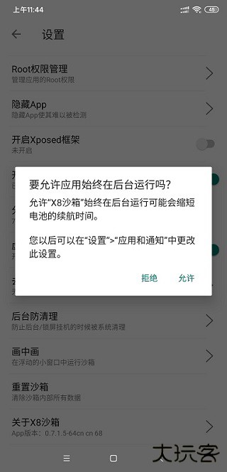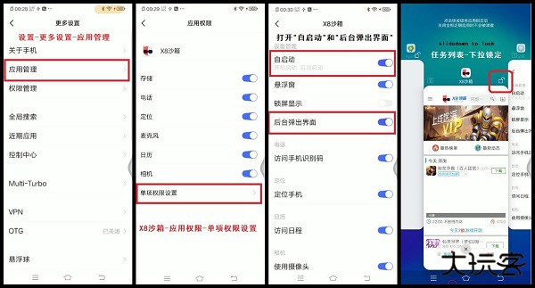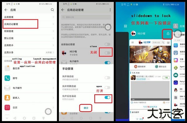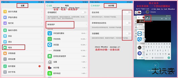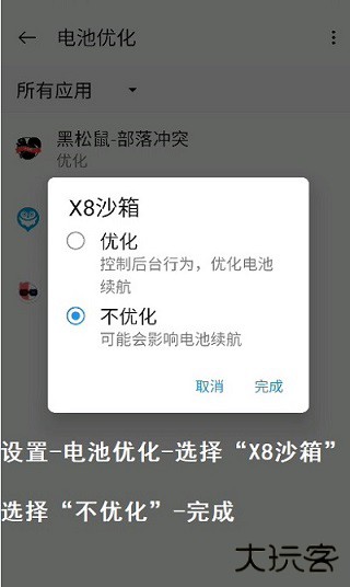 1、设置——电池——电池优化,选择“X8沙箱”——不优化;在任务栏中,锁定”X8沙箱”的应用;