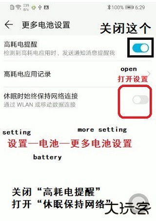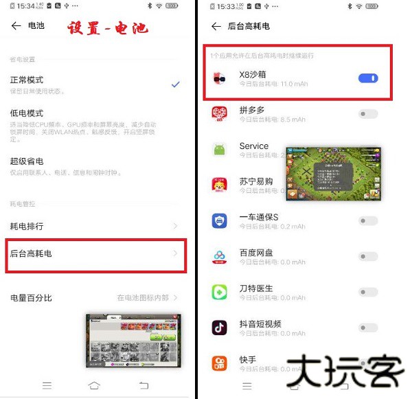 2、找到手机里面的设置-电池-省电那开关关闭,在下面的耗电保护列表里面找到X8沙箱,把后台冻结和异常耗电自动优化和深度睡眠全部搞成关闭状态即可。