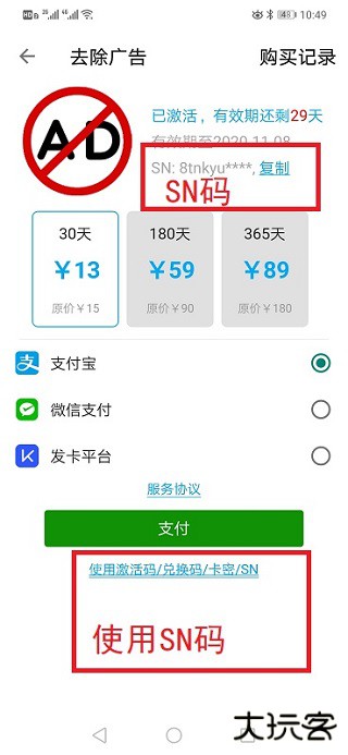 付费,是通过SN码的方式进行激活的(在用微信/支付宝方式购买时),会自动激活。因此,找回丢失的权限,也就是需要找回这个SN码。见下图:
