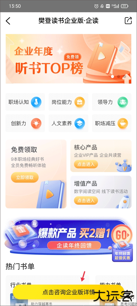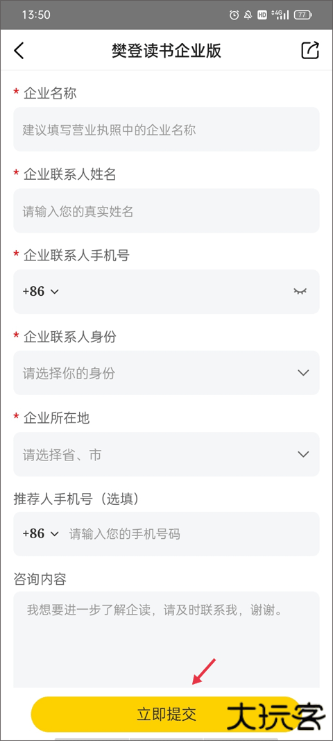 3、输入企业的名称、联系人名称、联系人手机号、所在地等具体信息,填写具体的咨询内容,最后点击立即提交就可以了,当系统审核通过后就可以拥有企业版的樊登读书会了。