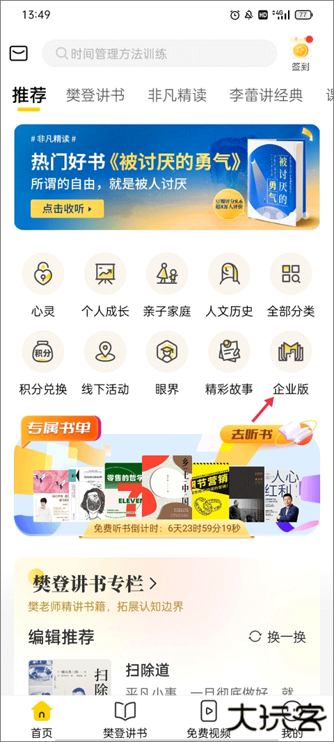 1、打开软件并进入到【首页】,在这里你会看到个人成长、积分兑换、线下活动、眼界、企业版等多个功能板块,点击“企业版”。