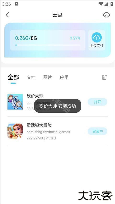 上传文件:可上传文档、图片、应用三种。在设备里的应用市场找不到你想运行的游戏的话就可以自行上传到云机里,设备外设备内部都有上传按钮,点击上传以后点击安装就可以在云机里使用了。