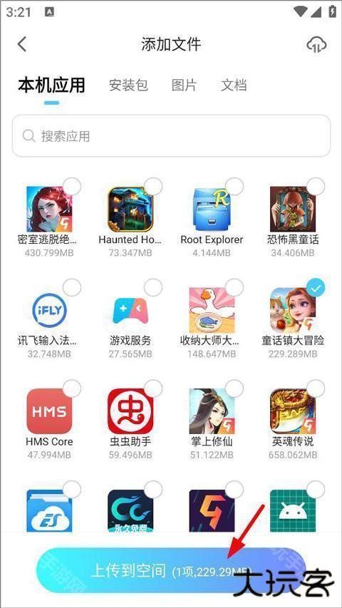 3、进入云盘页面点击上传文件按钮,进入添加文件页面,选择“应用”,勾选本地未安装需上传的APK文件;