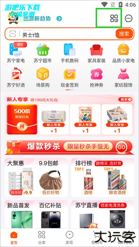1、打开并登录苏宁易购app,进入首页点击右上角第一个图标,如下图页面绿色方框区域内所示
