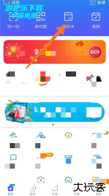 4、下载好之后,登录苏宁易购的账号。在苏宁XX软件首页,找到:银行卡。点击进去。