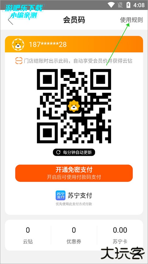 3、会员码是苏宁会员的唯一标识,阅读完使用规则后即可点击【开通免密支付】,开通后即可成为会员了