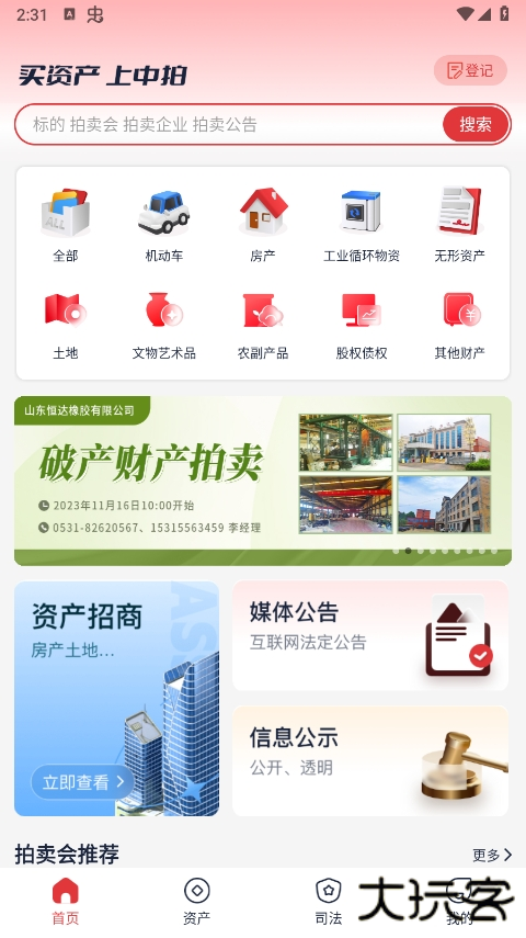 1、在本站下载安装该软件的最新版,打开进入首页,选择你想参拍的东西,这里以房产为例。