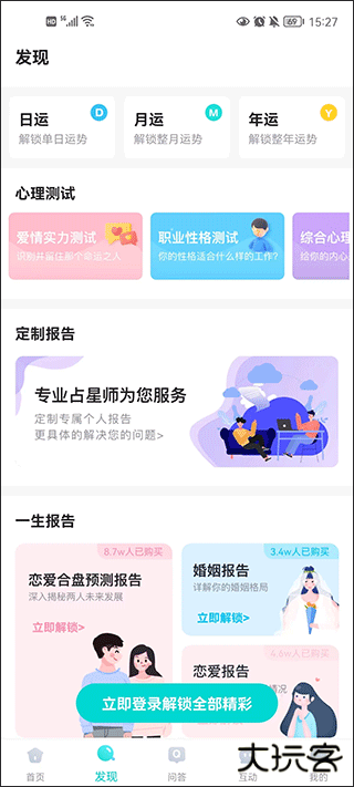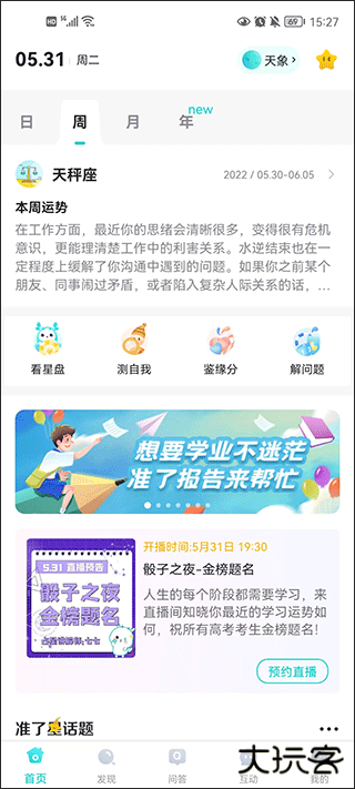 3、在发现中,不仅可以发现你的星座日、月、年运势,还可以为自己做个心理测试等等。